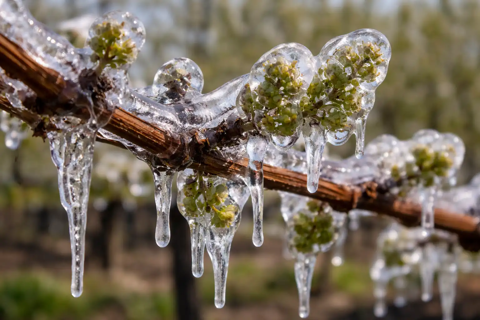 A principal razão para a falta de bagas são os danos botão central. As uvas podem libertar gomos de substituição, mas a maior parte das vezes são inférteis. Para o evitar, utilizo o método da “casca de gelo”, ou o método rega crioprotectora. A ideia é fazer com que a água congele na videira, libertando energia térmica latente que impede que os tecidos no interior arrefeçam até um ponto crítico.