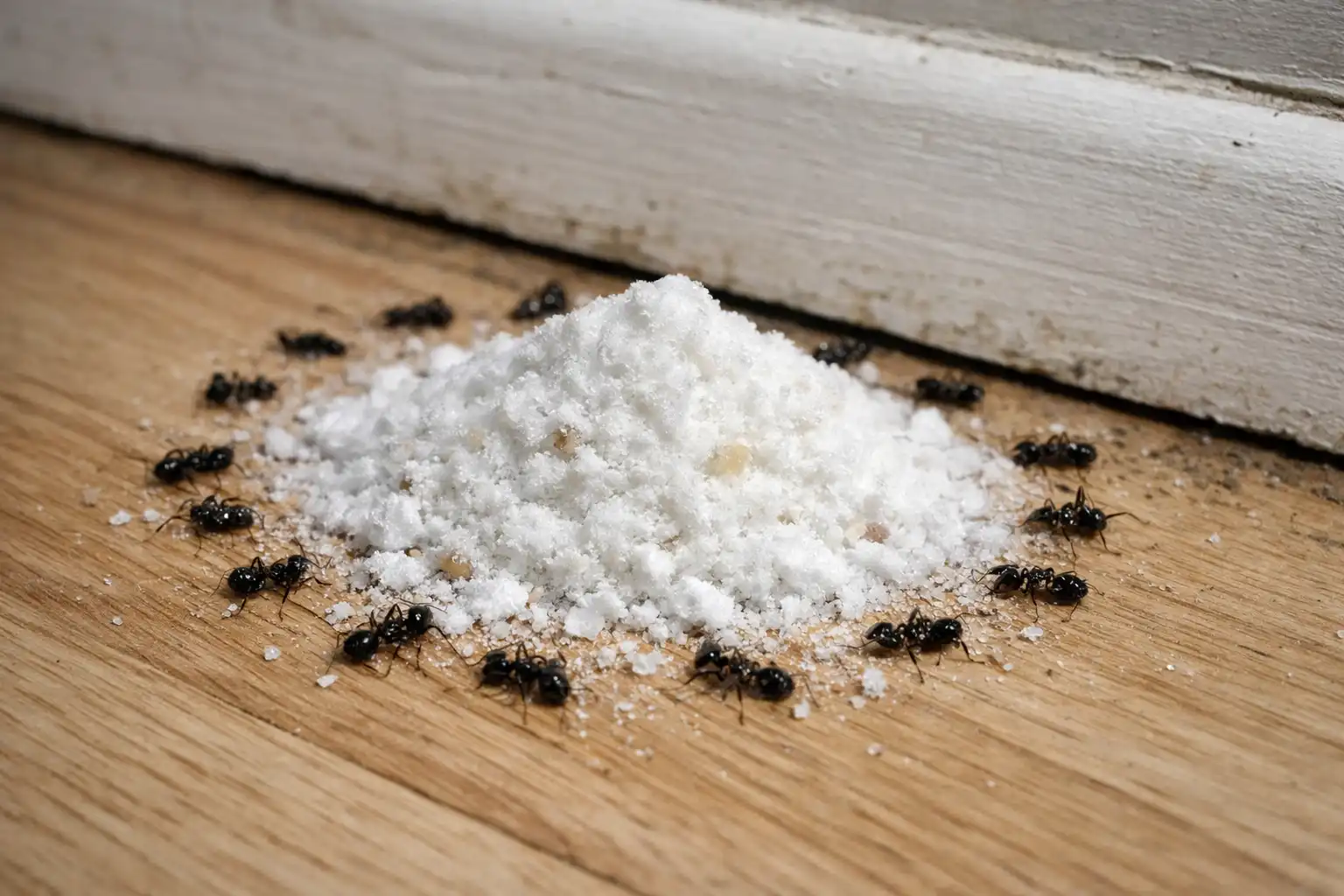 Um grande erro que muitas pessoas cometem é simplesmente espalhar pó ao longo do rodapé. As formigas são suficientemente inteligentes para contornar um obstáculo que não lhes pareça atrativo. Para que o método funcione, o bicarbonato de sódio deve ser transformado num “cavalo de Troia”.e misturado com hidratos de carbono, que os insectos arrastam para o coração do formigueiro.
