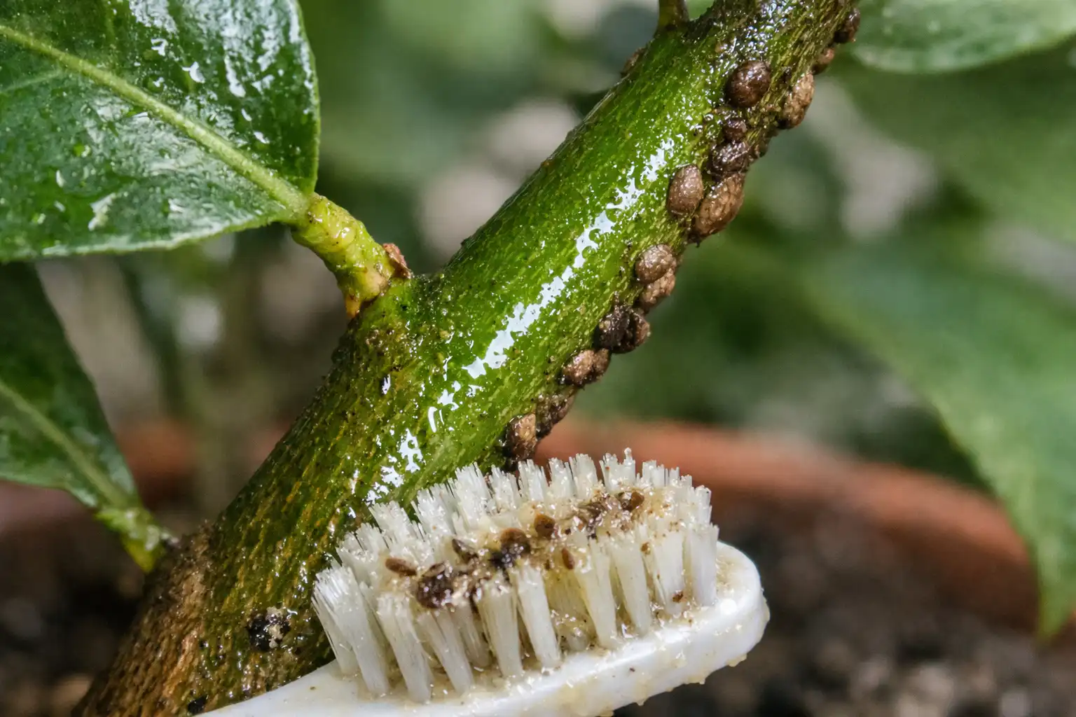 Mergulhe uma escova na solução e escove suavemente os adultos de cada ramo.