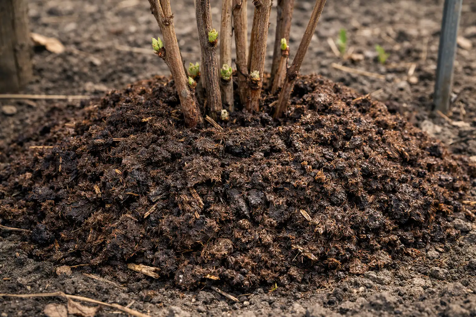 O estrume fresco só é aceitável como cobertura morta em cima de uma camada espessa de palha para evitar queimar as raízes superficiais.