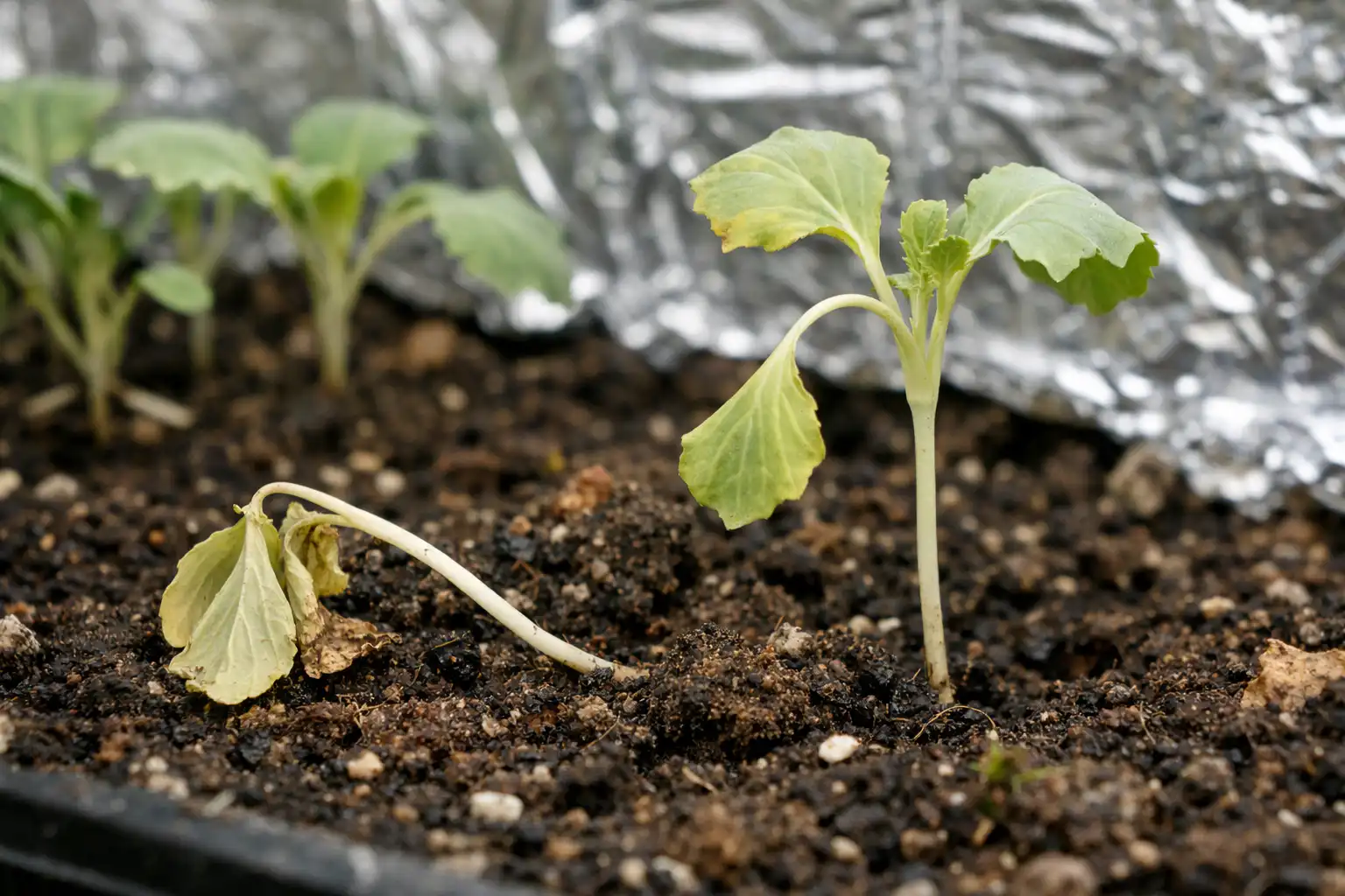 Quando as plântulas carecem de energia luminosa, começam a gastar todas as suas reservas de nutrientes no crescimento ascendente, tentando “alcançar” o sol. O resultado colo da raiz O colo da raiz fica mais fino, os vasos ficam apertados e a humidade deixa de estar disponível para as folhas. A planta murcha não por falta de água no solo, mas pela sua incapacidade de a absorver.