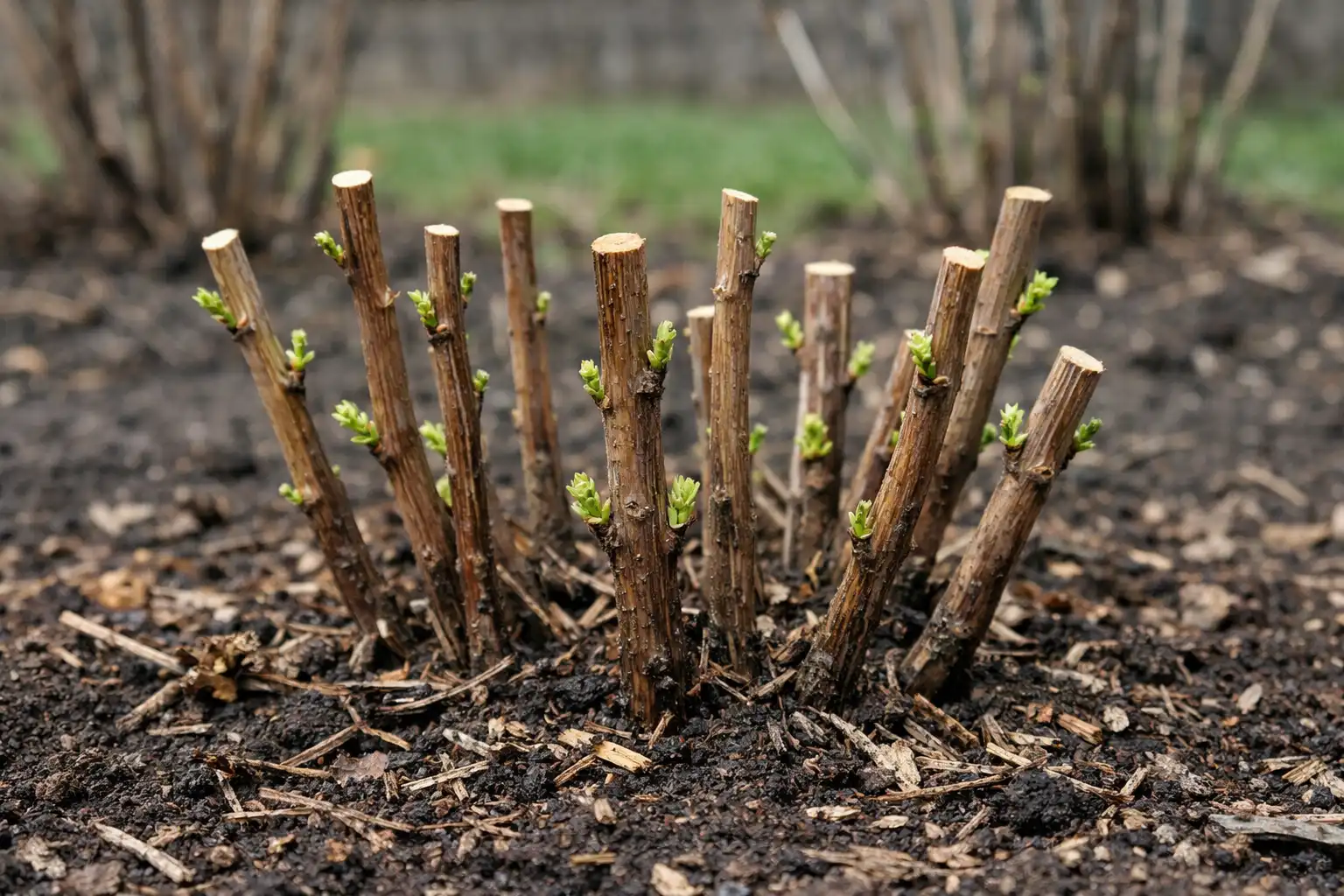 Corte os topos dos rebentos saudáveis restantes em 10-15 centímetros até um botão forte.
