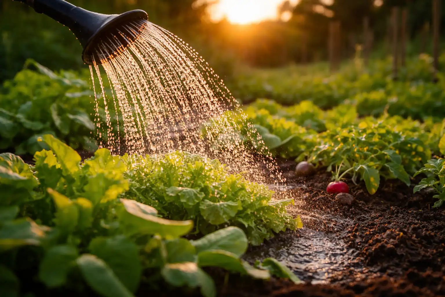 A hidratação nocturna é particularmente importante para rabanete, verdes e plantadas mudasque murcham instantaneamente quando há falta de humidade. Quando se rega durante o dia, as gotículas de água sobre as folhas funcionam como lentes, focalizando os raios solares e deixando queimaduras térmicas, o que inibe muito o crescimento da cultura.