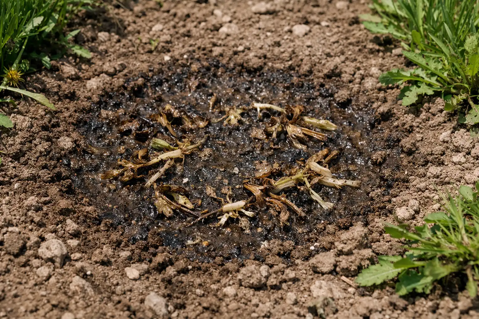 Deitar a solução precisamente no centro da roseta de ervas daninhas, tendo o cuidado de não atingir as plantas cultivadas.