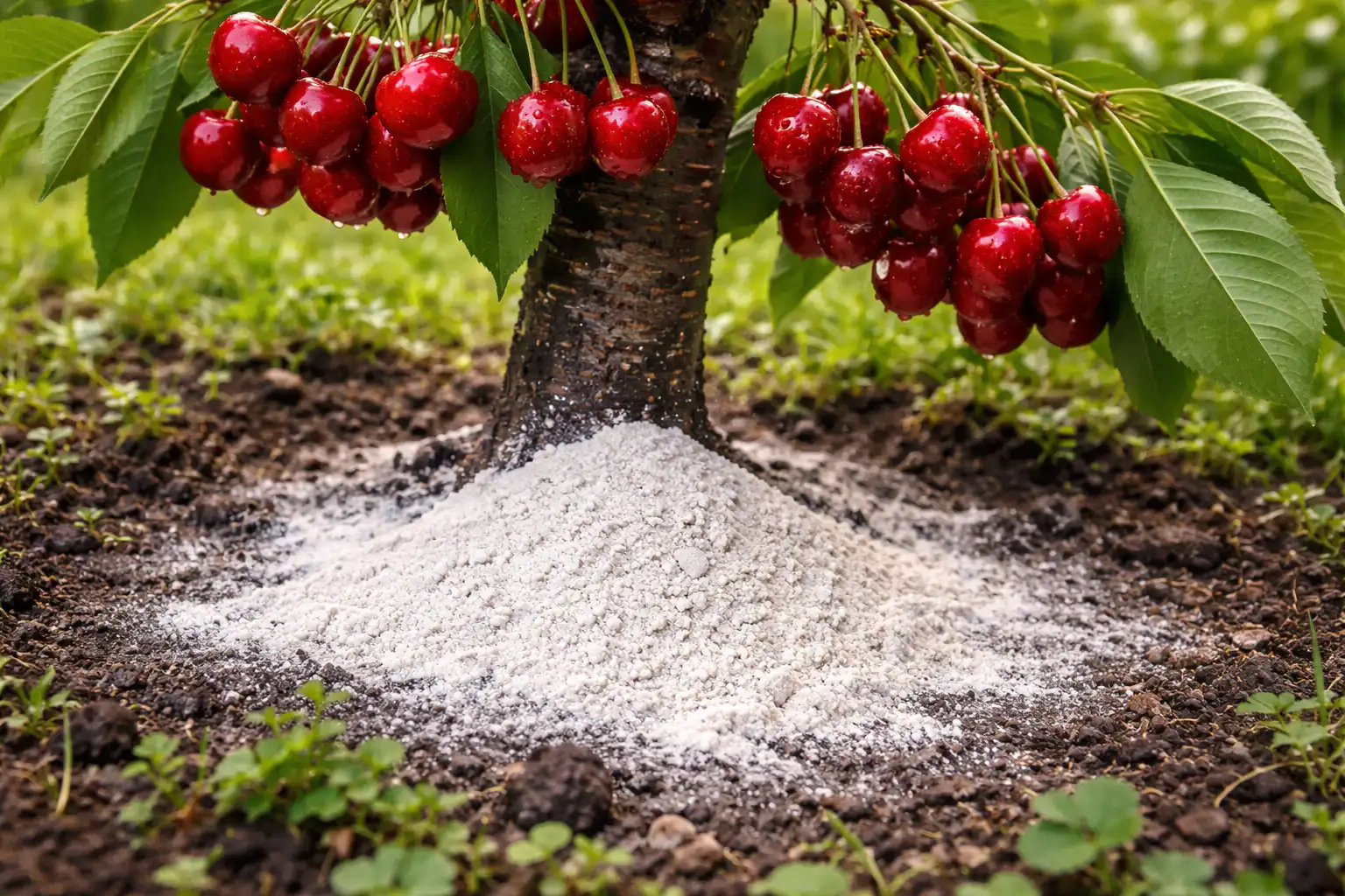 As cerejas são uma cultura que não tolera um ambiente ácido. Se o pH do solo for inferior a 6,0, as raízes não conseguem absorver o azoto e o potássio, por muito que se aplique. Farinha de dolomite actua mais suavemente do que a cal, não queima as raízes jovens e começa a atuar no momento em que a seiva está ativa.