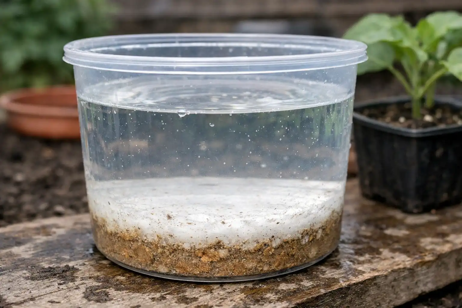 Um depósito de sal branco ou avermelhado aparece nas paredes dos copos e na superfície do solo.