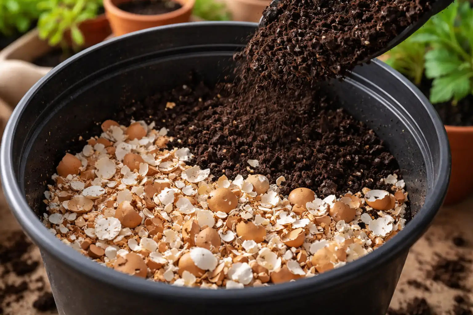 Essa combinação é aceitável, mas as cascas de ovo, por si só, cumprem as tarefas de drenagem e desoxidação do solo.