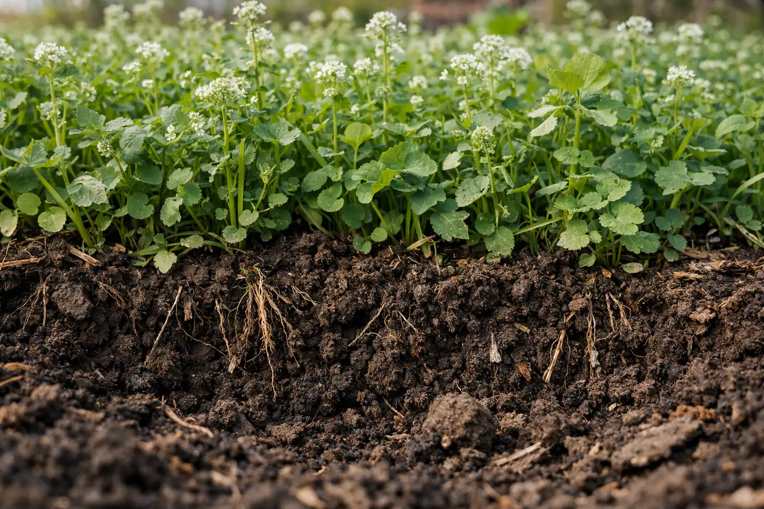 As chuvas da primavera e a água do degelo transportam o azoto para camadas profundas onde as raízes das plântulas simplesmente não conseguem chegar. As sideratas funcionam como uma bomba viva: trazem oligoelementos para a superfície e retêm-nos na sua biomassa.