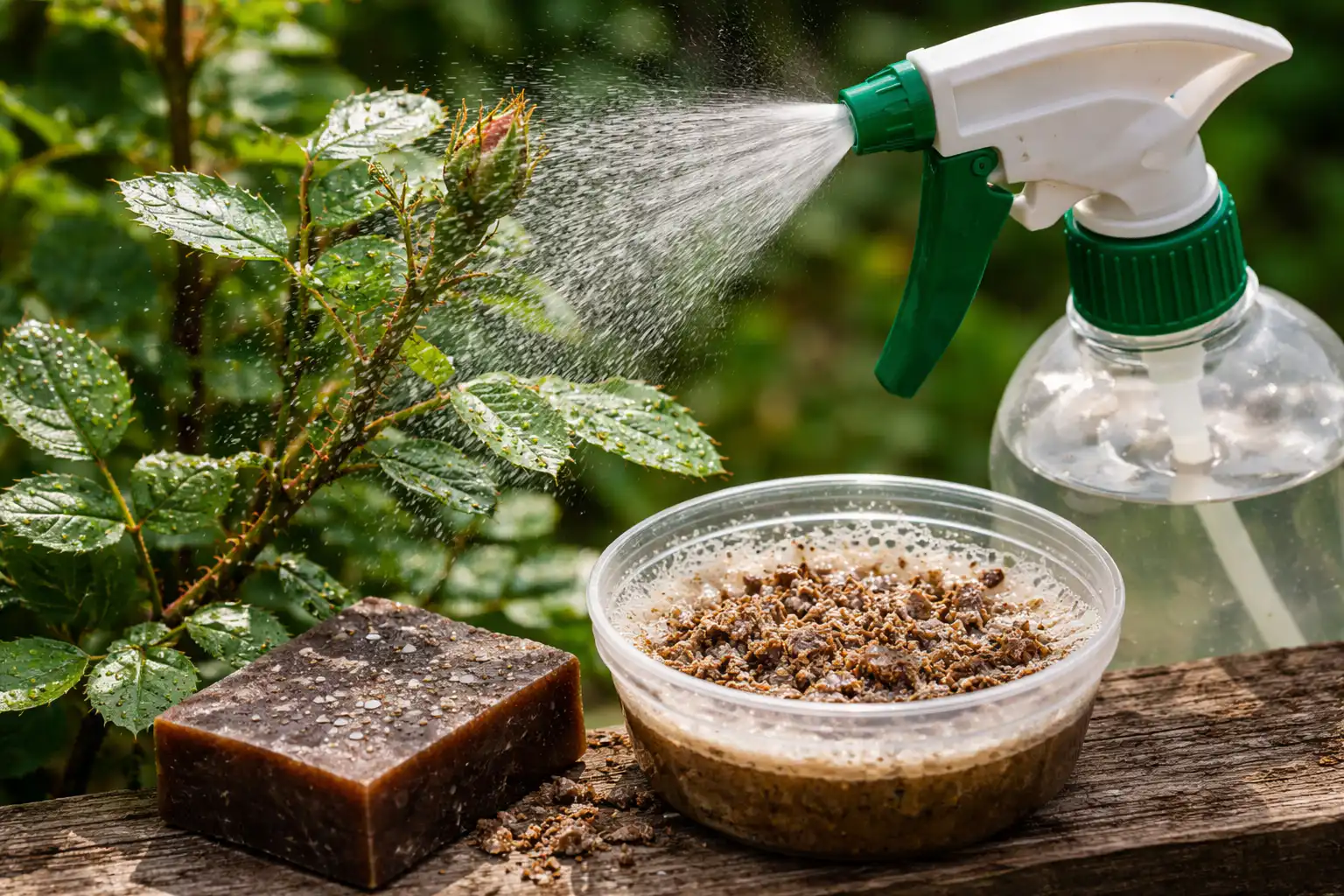 No jardim, utilizo a solução de sabão como base para a pulverização. Para preparar a mistura de trabalho, é necessário ralá-la num ralador sabão de alcatrão e dissolvê-lo em água morna até obter uma emulsão homogénea.