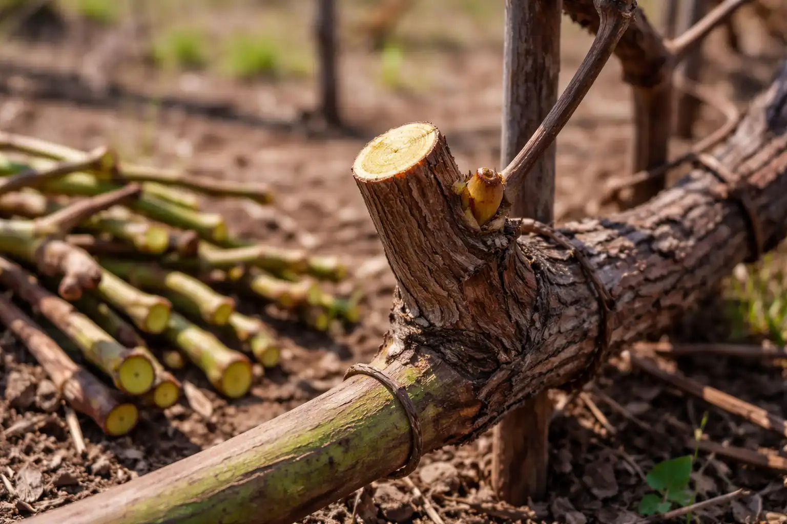 Corte a ponta da videira: se o tecido sob a casca estiver seco e escuro, significa que o rebento está morto e deve ser removido para um local vivo.