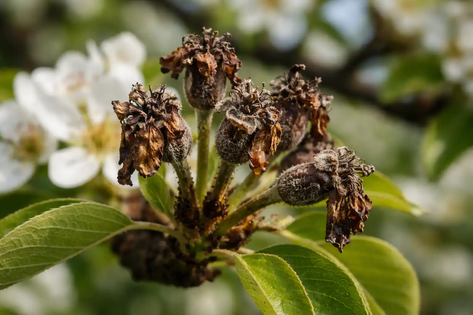 Se a árvore parecer carbonizada e as flores estiverem penduradas em trapos pretos, é provável que tenha encontrado uma bacteriose. Trata-se de uma doença perigosa que é transportada por insectos e pelo vento. Neste caso, os fungicidas convencionais não ajudarão; é necessária uma abordagem mais radical, utilizando agentes biológicos especializados.