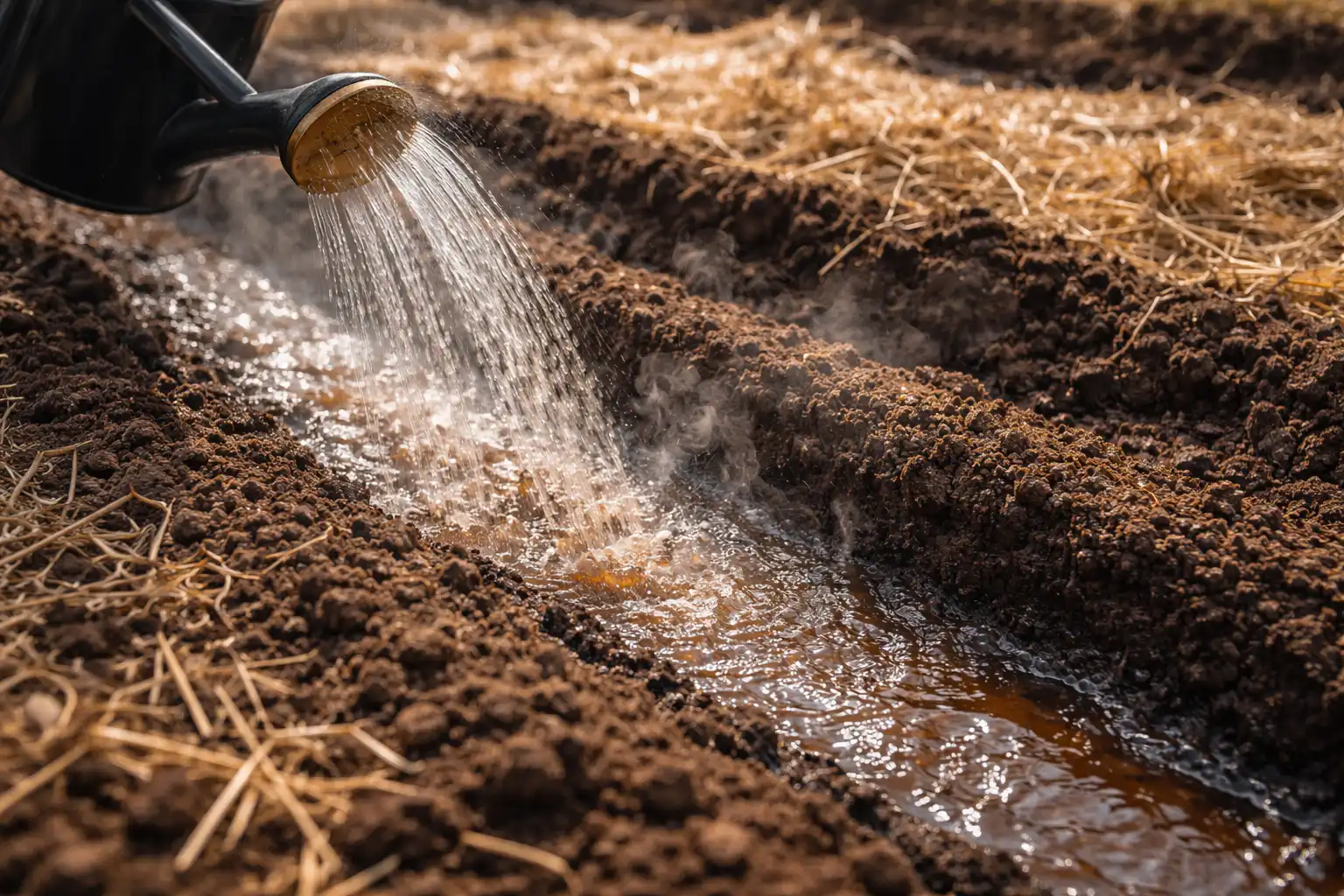 Regar à noite com água quente aumenta a transferência de calor do solo durante a noite, o que pode salvar as plântulas tenras das geadas ligeiras da manhã.