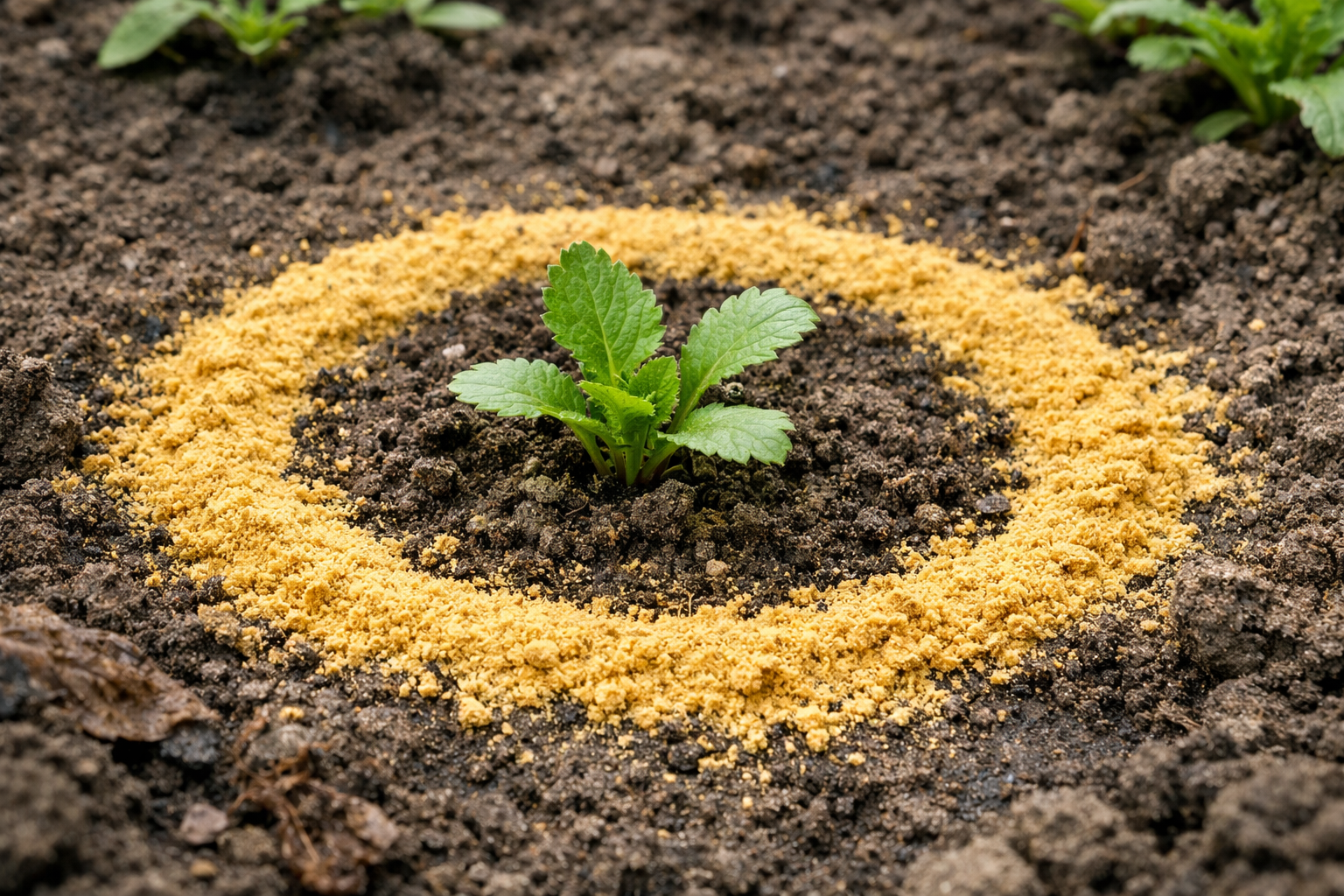 Polvilhar o solo diretamente à volta dos caules das plantas jovens.