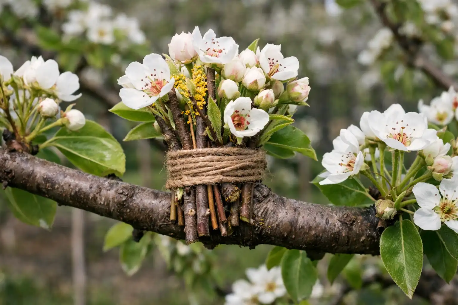 Este é o meu leafhack favorito que funciona 100% das vezes. Se não tiveres espaço para uma segunda árvore, usa um polinizador temporário. A ideia é simples: quando a sua pereira começar a florir, corte alguns ramos floridos de uma variedade diferente na árvore de um vizinho ou no bosque (as pereiras selvagens são um ótimo polinizador). dador de pólen).
