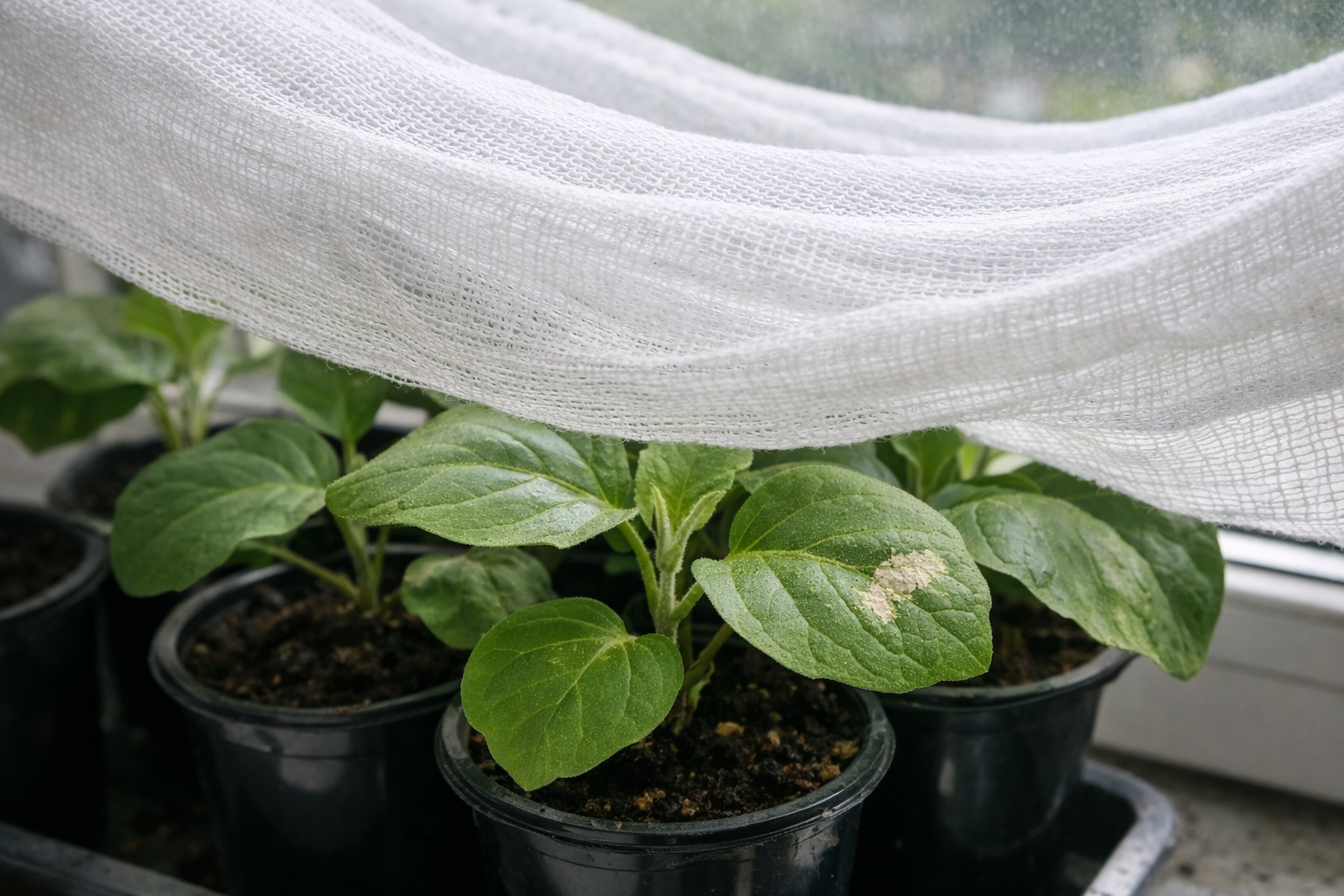As beringelas têm uma placa foliar muito larga que evapora ativamente a humidade. Quando a primavera brilhante sol aquece os tecidos delicados através do vidro, as raízes numa pequena chávena simplesmente não têm tempo para bombear água. Dá-se uma seca fisiológica: o solo fica húmido e as folhas murcham.
