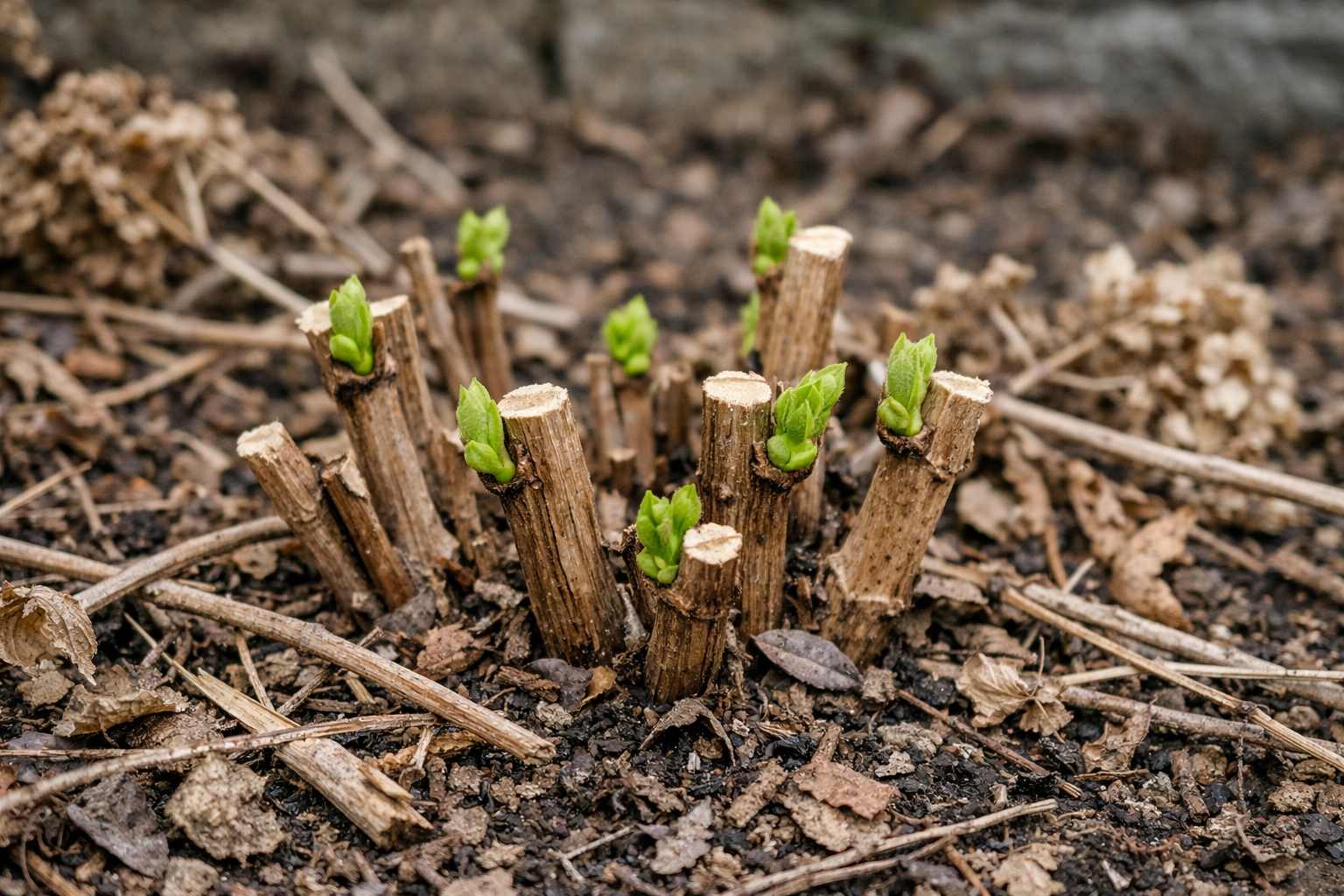 O período ideal é em março ou no início de abril, quando a neve já derreteu mas os botões ainda não começaram a crescer.