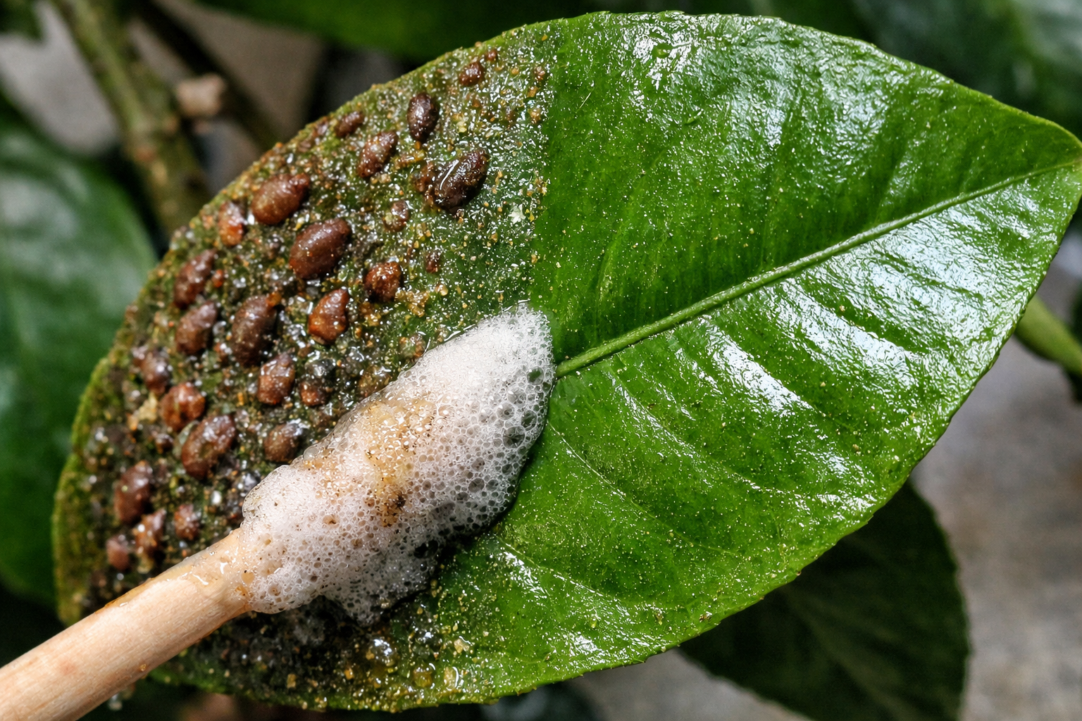 Remova manualmente cada placa castanha dos ramos e das folhas, molhando a escova na solução.
