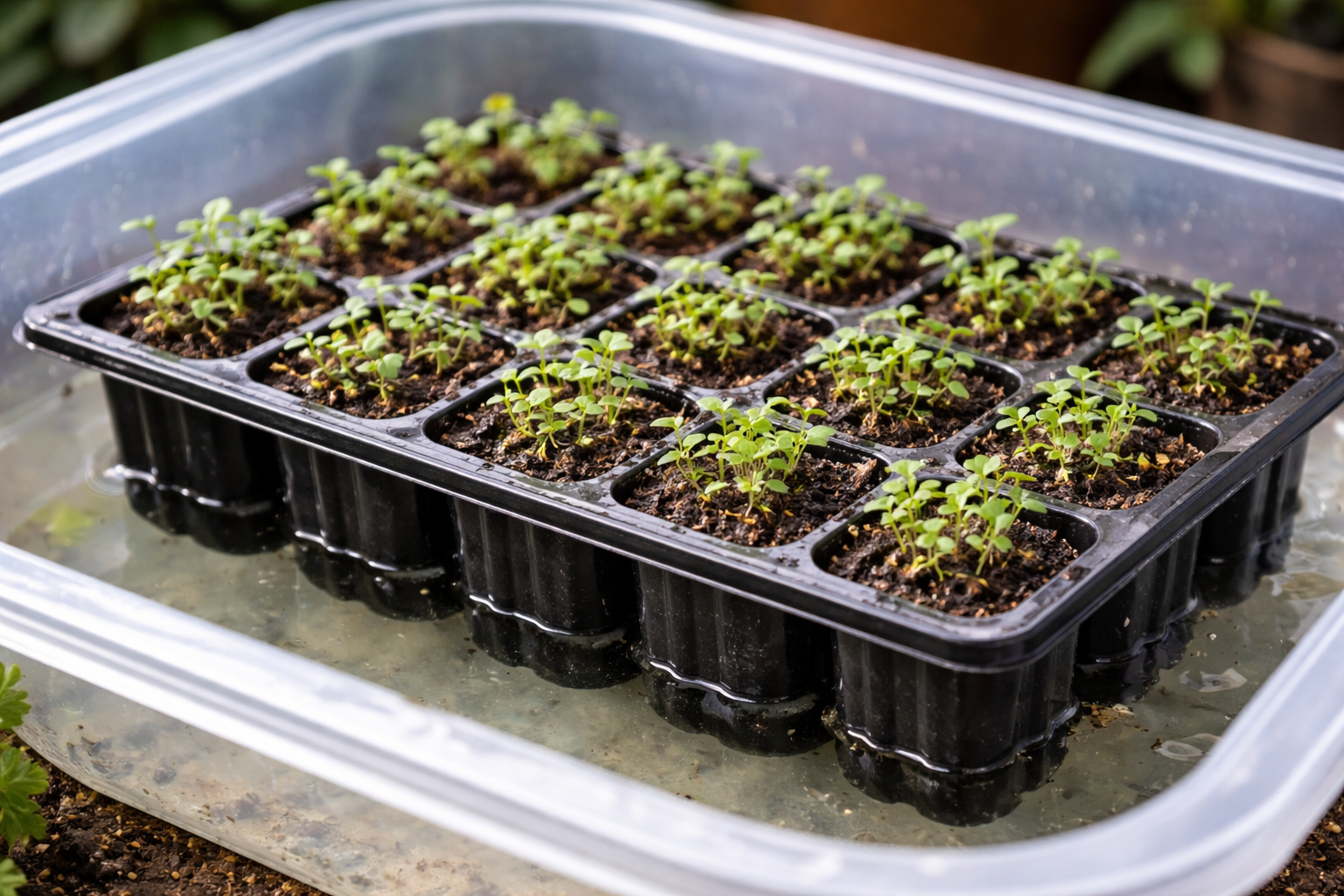 Para evitar o pé negro e a dessecação simultânea, utilizo a tática de rega de fundo. A água vai diretamente para as raízes e a superfície do solo permanece moderadamente húmida, o que impede o desenvolvimento de fungos.