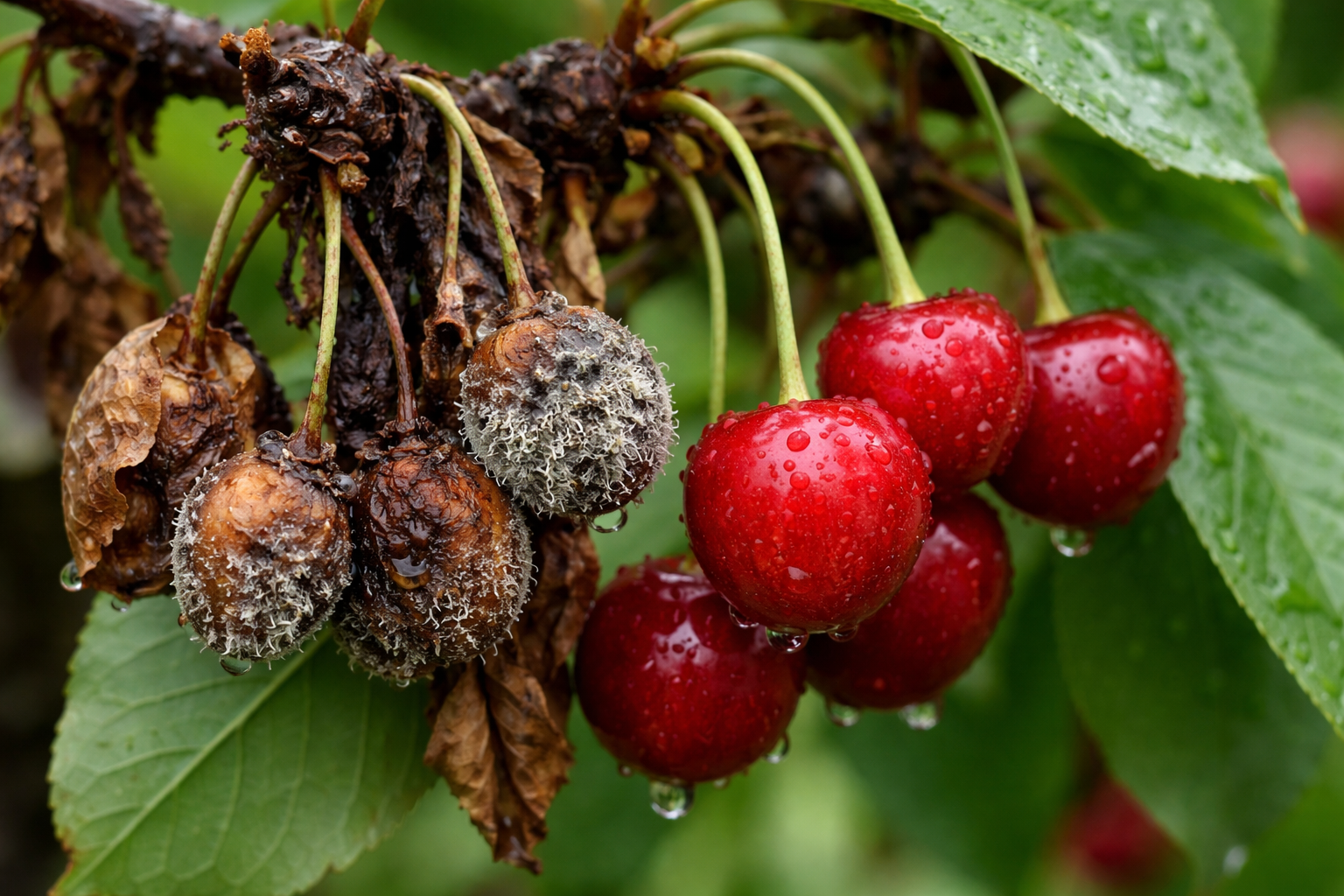 Fungos Monília Os esporos são activados no tempo fresco e húmido da primavera. Os esporos entram no pistilo da flor, germinam profundamente na madeira e obstruem os vasos, fazendo com que os rebentos inteiros pareçam queimados. Se se perder o momento da floração, a árvore não só fica sem bagas, como pode morrer completamente num par de estações.