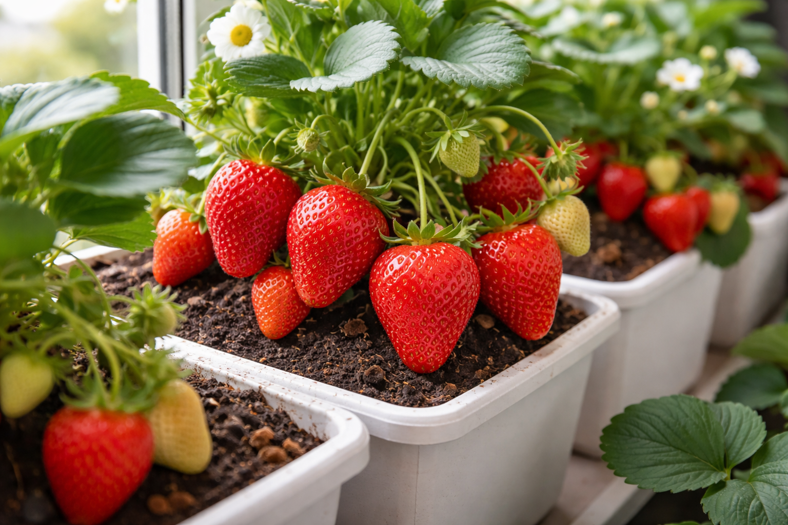 Tapete rolante de morangos no parapeito da janela desde a primeira vez