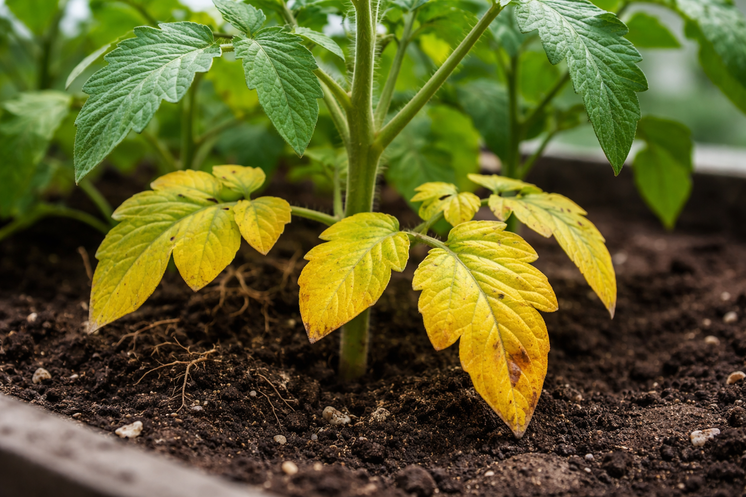 Quando um tomateiro tem falta de nutrientes, entra em modo de sobrevivência. A planta absorve azoto e outros elementos móveis das velhas folhas inferiores para permitir o crescimento do topo. Este é um processo natural de redistribuição de energia, mas se não for interrompido, perder-se-á todo o arbusto.