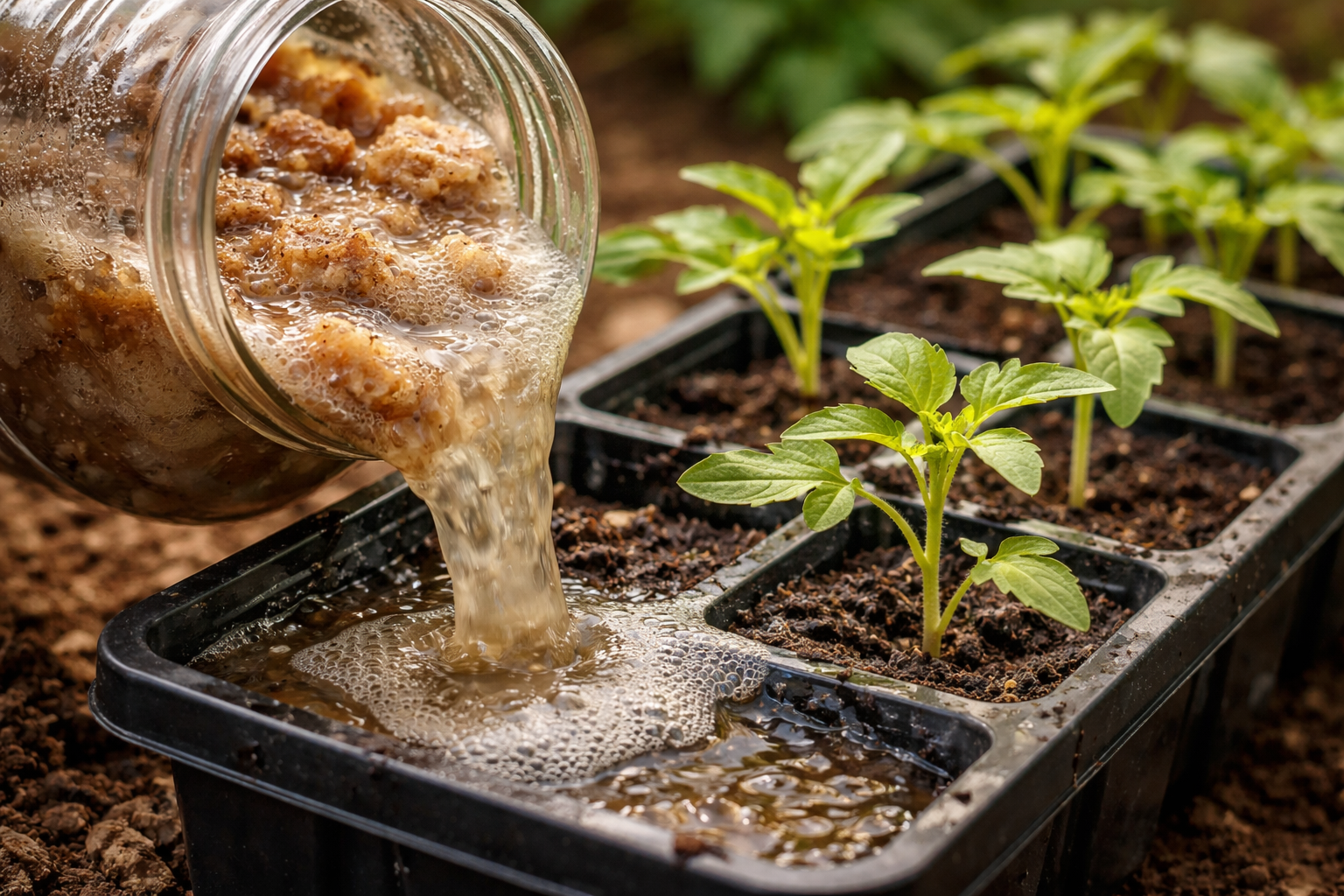 Não se esqueça de diluir o concentrado preparado com água limpa antes de regar para evitar queimar as raízes jovens e tenras das plântulas.