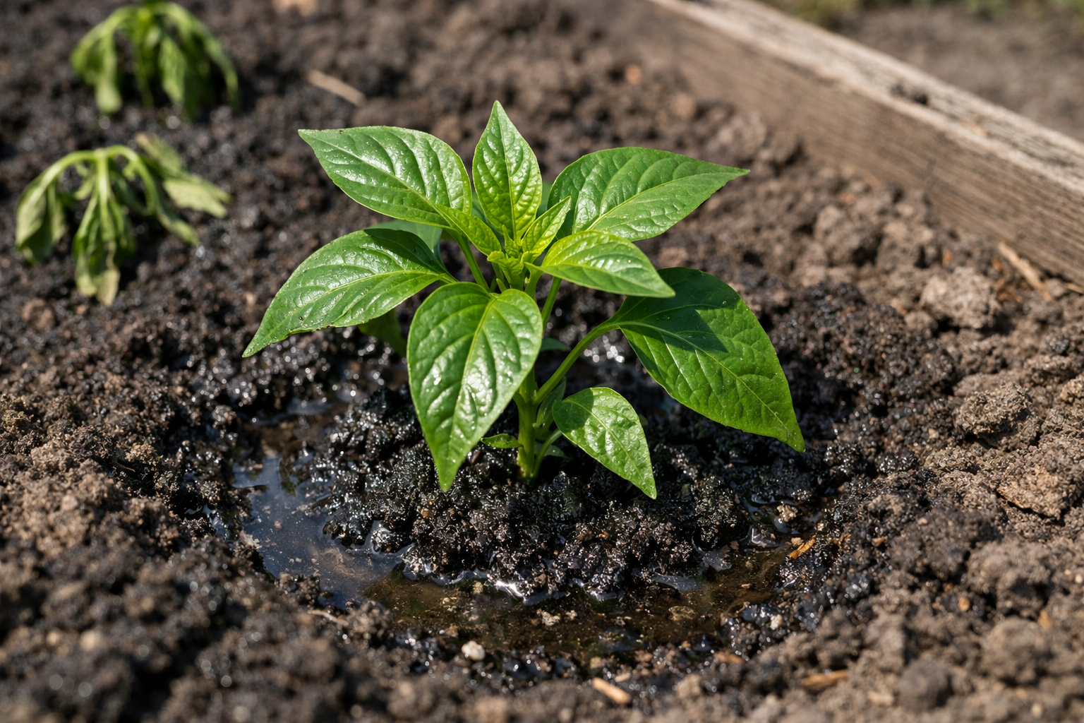 O principal segredo da rápida adaptação dos pimentos reside na correta cobertura vegetal a cobertura morta dos canteiros imediatamente após a transplantação, mantendo assim um microclima ideal e uma humidade estável para as raízes.