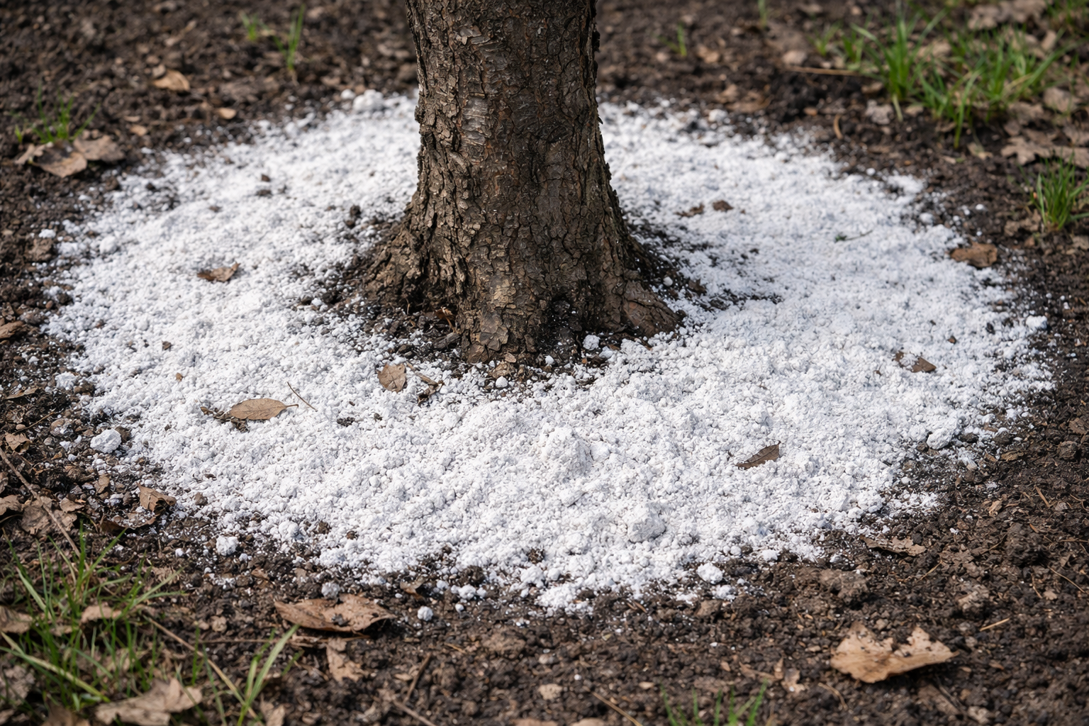 O principal segredo de aplicação: aplicar o pó apenas na projeção da copa, onde se encontram as raízes sugadoras activas, e não diretamente no tronco da árvore.