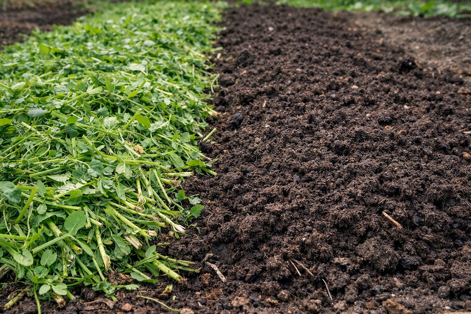 É suficiente cortar as raízes com um cortador de arado a uma profundidade de alguns centímetros e deixar as verduras decomporem-se diretamente no canteiro.