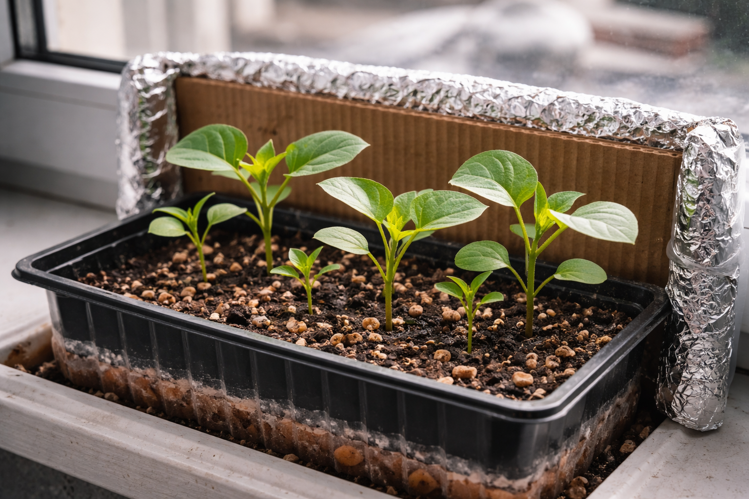 Colocar folhas de espuma por baixo dos recipientes para mudas para isolar o fundo.
