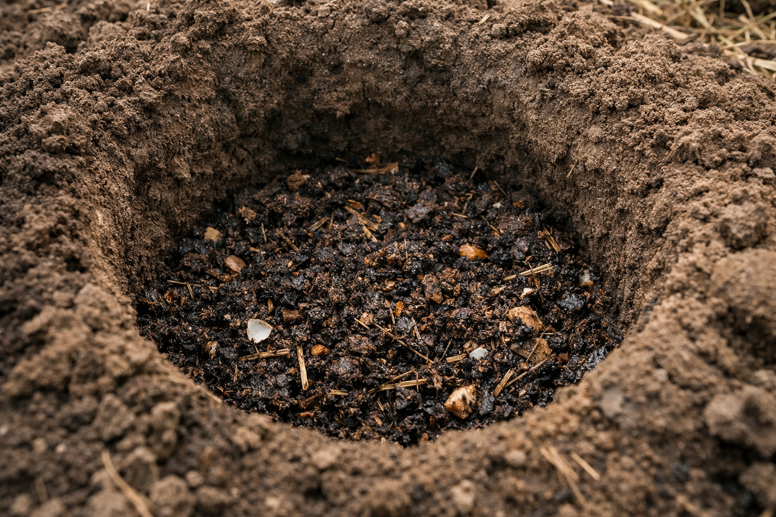 Colocar uma camada espessa de composto demasiado maduro no fundo do buraco